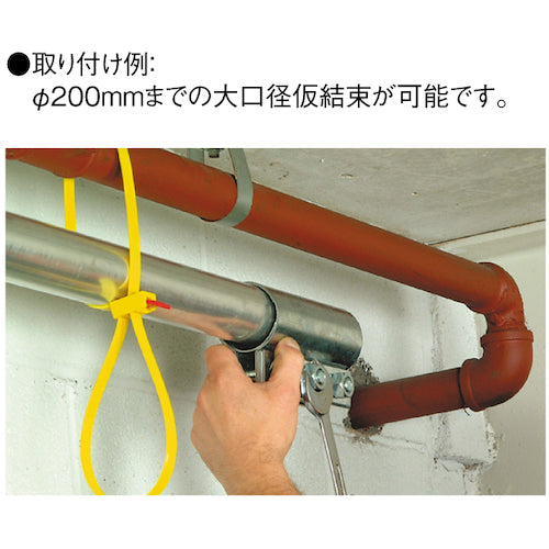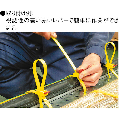 Catalog number: RTT-750HR-3P Features: ●Re-tieable cable tie with a diameter of 200 mmΦ. ●The combination of a yellow strap and a red lever provides excellent visibility and makes removal easy. Applications: ●For temporary fastening of pipes for air conditioning, etc., and for temporary fastening when laying cables. ●For temporary fastening when aligning large safety nets when installing them. ●For bundling rolls of mats for storage, or for closing the openings of large bags. Specifications: Color: Yellow (Red) Width (mm): 13 Length (mm): 752 Maximum binding diameter (mm): 200 Tensile strength (N): 889 (approx. 90kgf) Operating temperature range (℃): -45 to 85 Band width (mm): 13 Maximum binding diameter (mm): φ200 Loop tensile strength (N): 889 (approx. 90kgf) Specifications: Repeat type, standard indoor grade (use for short-term purposes such as temporary fastening outdoors) Large diameter temporary fastening cable tie Indoor use Operating temperature range: -40℃ to +85℃ UL flame retardant grade (main material): UL94V-2 Material/Finish: 66 nylon Caution: Do not tie fingers or other parts of the body. This nylon product has been subjected to appropriate moisture conditioning treatment during the manufacturing process. In order to maintain the effect of the moisture conditioning treatment, we recommend using it as soon as possible after opening and sealing the bag when storing it. ●During cold seasons, leave the product at room temperature for a while before using.