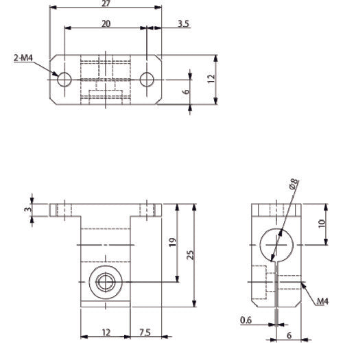 Catalog number: N01866-502 Features: ●The mounting surface is tapped, allowing the mounting of cylinders, etc. Specifications: ●Compatible size (mm): φ8 ●Width (mm): 27 ●Depth (mm): 12 ●Height (mm): 25 ●Mounting hole: M4 ●Nominal dimension (mm) d×L: 12 ●Jungle gym series Material/Finish: ●Super duralumin