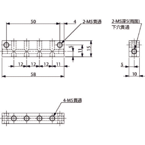Catalog number: MM-10P Features: ●Branches the air circuit into multiple parts. Specifications: ●Length (mm): 15 ●Width (mm): 58 ●Height (mm): 10 ●Connection diameter: M5 Material/Finish: ●Aluminum