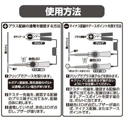 Catalog number: 2001000009855 Features: ●Can be used for small motorcycles to trucks. Applications: ●Tester that can check the current status of wiring and fuses Specifications: ●Total length (excluding cord) (mm): 152 ●Usable range (V): DC6 to DC24 ●Maximum cord length (m): ~approx. 1.8 ●Can measure DC6V to DC24V ●Red LED lights up when positive polarity is energized ●Green LED lights up when negative polarity is energized ●Buzzer sounds when energized ●Magnet on the side of the clip Material/Finish: ●ABS (main body) ●Clip (steel) Caution: ●※The tip of the tester is sharp, so be careful when handling it to avoid injury, and be sure to attach the protective cap after use. ●※When inserting it into the wiring to test the voltage, do not insert it into the same place. ●※When using in the engine room, be careful to handle the cord so that it does not get tangled. ●※The tone and volume will change depending on the contact condition and voltage condition of the tester. ●*If you pull the cord too hard, it may not return to its original position.