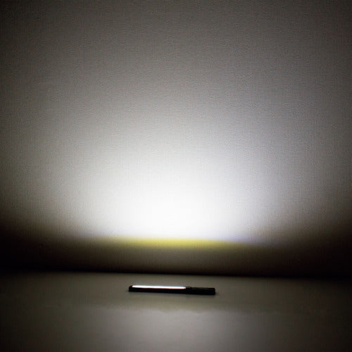 Catalog number: 2005000007859 Features: ●Lightweight and ultra-thin rechargeable LED work light. ●10 levels of brightness can be adjusted by turning the power button left and right. ●Two magnets on the back allow it to be attached to a steel surface. ●Can also be hung from the retractable hook at the tip. ●Press the power button to turn on the light at 200lm brightness, and while it is on, turn the power button left to make it darker, or right to make it brighter. ●Press the power button again to turn off the light. Specifications: Brightness (lm): 400 Width (mm): 40 Depth (mm): 18 Height (mm): 300 Body size: L300 × W40 × D18mm Weight: 125g LED: 5W COB Built-in battery: Lithium-ion battery Battery voltage: 3.7V Battery capacity: 1200mAh Lighting pattern: 1 stage (20lm) 2 → 3 → 4 → 5 (200lm) → 6 → 7 → 8 → 9 → 10 (400lm) Indicator lamp display: Red light during charging, green light when charging complete Luminous flux: 20 to 400lm Continuous lighting time: Approximately 1.5 hours (maximum luminous flux 400lm) Charging time: Approximately 2 hours (5V1A power supply) Main unit functions Over-discharge prevention, over-charge prevention, 10-stage dimming Material / Finish: Body: ABS Lens: PC Set contents / Accessories: USB cable (approximately 1m)