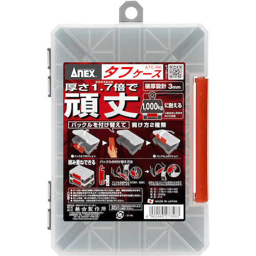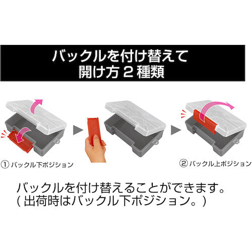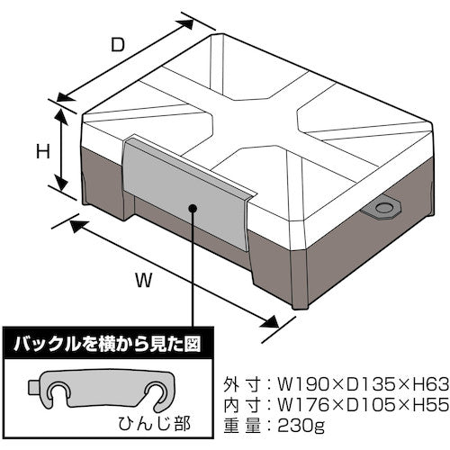 Catalog number: ATC-RK Features: ●A sturdy storage case with an extra-thick design of 3 mm. ●Can withstand a load of 1000 kg (measurement when the load is applied to the entire top surface). ●Can be opened in two different ways by changing the buckle. ●Comes with stacking grooves for stacking. Uses: ●For storing tools, etc. Specifications: ●Color: Top cover: White translucent, bottom: Gray, buckle: Red translucent ●External dimensions (mm) Width: 190 ●External dimensions (mm) Depth: 135 ●External dimensions (mm) Height: 63 ●Effective internal dimensions (mm) Width: 176 ●Effective internal dimensions (mm) Depth: 105 ●Effective internal dimensions (mm) Height: 55 ●Load capacity (kg): 1000 (entire top surface) ●Thickness: 3 mm Material/Finish: ●Body: Polypropylene (PP)