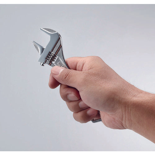 Catalog number: UM24 Features: ● Work in narrow spaces or when using thin bolts and nuts can be easily performed, which was difficult with previous monkey wrenches. ● Sufficient strength to meet JIS strength standards. ● Unique bold form and significant weight reduction. ● Wide mouth opening allows tightening of bolts and nuts one size larger. Specifications: ● Color: Silver ● Total length (mm): 150 ● Maximum mouth opening (mm): 24 ● Mouth opening (mm): 0-24 ● Tip thickness (mm): 5 ● With or without grip: None ● Maximum bolt and nut size: M16 Material/Finish: ● Special steel Caution: ● Make sure to match the mouth width to the two sides of the bolt or nut at the back of the mouth. ● Turn in the direction of the lower jaw. ● Do not use by adding pipes, etc. ● Do not use as a hammer substitute or by hitting with a hammer, etc.