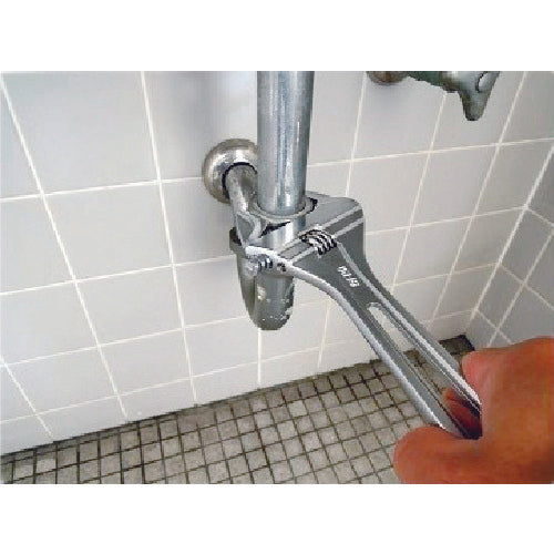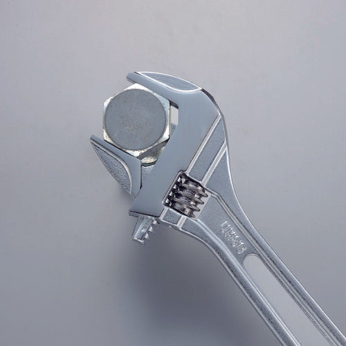 Catalog number: UM30 Features: ● Work in narrow spaces or when using thin bolts and nuts can be easily performed, which was difficult with previous monkey wrenches. ● Sufficient strength to meet JIS strength standards. ● Unique bold form and significant weight reduction. ● Wide mouth opening allows tightening of bolts and nuts one size larger. Specifications: ● Color: Silver ● Total length (mm): 200 ● Maximum mouth opening (mm): 30 ● Mouth opening (mm): 0-30 ● Tip thickness (mm): 6 ● Grip: None ● Maximum bolt and nut size: M20 Material/Finish: ● Special steel Caution: ● Make sure to match the mouth width to the two sides of the bolt or nut at the back of the mouth. ● Turn in the direction of the lower jaw. ● Do not use by adding pipes, etc. ● Do not use as a hammer substitute or by hitting with a hammer, etc.