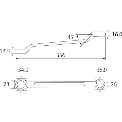 Catalog number: OW2326 Features: ●The glove uses a surface contact type. ●Ideal for final tightening. ●The handle is easy to grip and has a reinforced cross-sectional shape that is resistant to bending. ●The matte finish makes it non-slip even when oily. ●The size markings have been enlarged to improve visibility. Applications: ●Attaching and removing bolts and nuts. Specifications: ●Face size (mm): 23 x 26 ●Total length (mm): 356 ●Neck angle (°): 45 ●Long, 45° x 6° type ●12-sided, surface contact ●Matte finish ●Head thickness x width (mm): 23mm side: 16.0 x 34.0/26mm side: 16.0 x 38.0