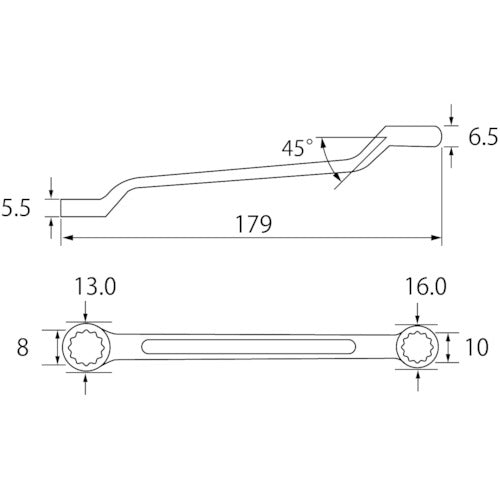 Catalog number: OW810 Features: ●The glove uses a surface contact type. ●Ideal for final tightening. ●The handle is easy to grip and has a reinforced cross-sectional shape that is resistant to bending. ●The matte finish makes it non-slip even when oily. ●The size markings have been enlarged to improve visibility. Applications: ●Attaching and removing bolts and nuts. Specifications: ●Face size (mm): 8 x 10 ●Total length (mm): 179 ●Neck angle (°): 45 ●Long, 45° x 6° type ●12-sided, surface contact ●Matte finish ●Head thickness x width (mm): 8mm side: 5.5 x 13.0/9mm side: 6.0 x 14.5 Material/Finish: ●Special steel