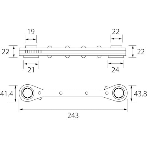 Catalogue number: SRW1924 Features: ●One tool can handle 4 sizes. ●The body is stainless steel and resistant to rust. ●Safety rope attachment hole included. (Excluding SRW558 and 912) ●Effective in tight spaces where socket wrenches and ratchet wrenches cannot fit. ●The socket part is perforated so it can be used with long bolts. Specifications: ●Face size (mm): 19 x 21, 22 x 24 ●Thickness (mm) T1: 22 ●Thickness (mm) T2: 22 ●Total length (mm): 243 ●Face (mm): 19 x 21, 22 x 24 Material/Finish: ●Stainless steel