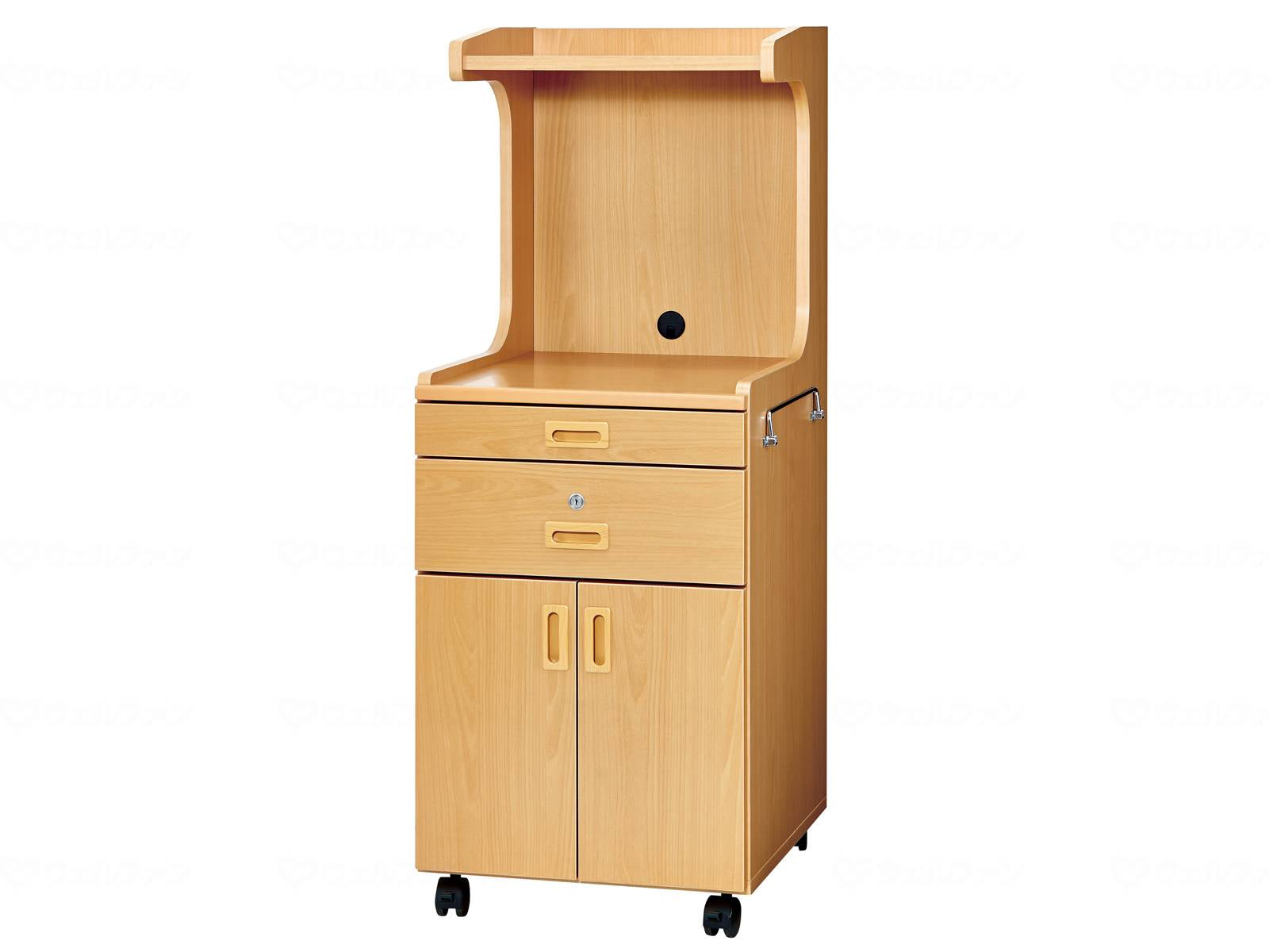 Standard equipment: Sliding dining table top, lockable drawer, casters with stoppers (2 pieces), towel rack, and one shelf with 3 levels on the lower hinged door.