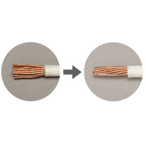 Catalog number: COS-WD-22 Features: ● Simply insert loose twisted wire and turn to neatly dress it. Applications: ● For arranging loose wires. Specifications: ● Color: Green ● Suitable wire size [mm2]: 8 to 22