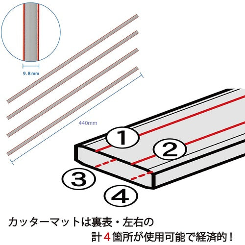Catalog number: DCM-375 Features: ●Replacement cutter mat for disc cutters. ●By replacing the cutter mat, you can maintain a more comfortable sharpness. ●The cutter mat can be used in two places on one side by switching between left and right, for a total of four places on both sides. Specifications: ●Total length (mm): 440 ●Depth (mm): 9.8 ●Height (mm): 3 ●Compatible models: DC-220N, DC-220 ●Compatible models (discontinued): DC-220, DC-220N ●Quantity: 4 pieces per bag Material/Finish: ●PVC