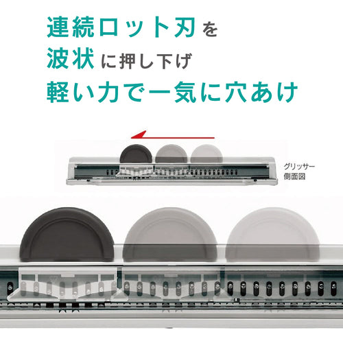 Catalog number: GSP-30 Features: ●This sliding multi-hole punch can handle multiple holes just by sliding it. ●The blade punches holes one by one in the paper, so anyone can punch holes with light force. ●Just slide it to quickly handle multiple holes of "A4 size 30 holes". ●When sliding, the 30 blades go down in order to punch holes. ●The large-capacity waste tray is also ideal for shared items. ●Copy paper and printed paper become loose-leaf and can be bound into binder notebooks. Specifications: ●Number of sheets that can be punched (sheets): 5 ●Width (mm): 465 ●Depth (mm): 85 ●Height (mm): 96 ●Hole diameter (mm): 5.5 ●Type: A4 size 30 holes ●For binder notebooks ●Hole diameter: 5.5mm ●Hole spacing: 9.5mm ●Hole depth: 6.35mm (from the center of the hole to the edge of the paper) Material/Finish: ●SECC, ABS, POM