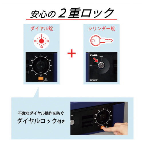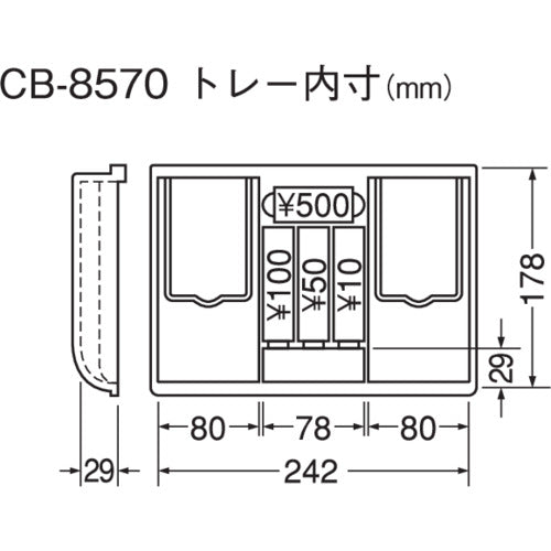 Catalog number: CB-8570 Features: ● Double lock with cylinder lock and dial lock for perfect management. ● Inner cover with sponge prevents coins from scattering when carried. ● Dial lock function prevents accidental dial operation. ● Two-tiered left and right bill trays can store four types of bills. ● Equipped with a document holder that is ideal for temporarily organizing slips. ● Free space below the trays for storing receipts, contracts, personal seals, etc. ● Coin storage capacity: 32 500 yen coins, 46 100 yen coins, 44 50 yen coins, 50 10 yen coins. Specifications: ●Capacity (L): 2.9 ●Color: Blue ●Body dimensions (mm) width: 278 ●Body dimensions (mm) depth: 218 ●Body dimensions (mm) height: 134 ●Effective internal dimensions (mm) width: 244 ●Effective internal dimensions (mm) depth: 168 ●Effective internal dimensions (mm) height: 73 ●Document storage size: A5 size ●Locking: Cylinder lock, dial lock ●Specifications: Dial lock function, two-tier banknote tray, coin scattering prevention, document holder ●Number of coins stored: 32 500 yen coins, 46 100 yen coins, 44 50 yen coins, 50 10 yen coins ●A5 size storage ●Two-tier banknote tray ●Dial lock function ●Document holder ●Coin scattering prevention Material/Finish: ●Cold-rolled steel plate (SPCC), ABS resin Set contents/Accessories: ●2 keys Note: ●The effective dimensions are the size when the tray is inserted.