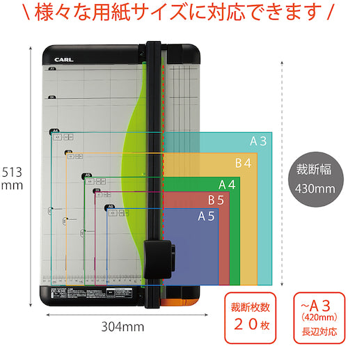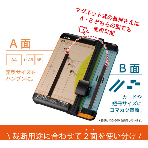 Catalog number: DC-630 Features: ●Two sides can be used depending on the cutting purpose. ●The left and right boards next to the slider rail can be used to place the paper guide ruler depending on the cutting purpose. ●The rotating blade is attached inside the slider, allowing for safe cutting. ●For fine cutting such as cutting strips, the paper guide ruler can be placed on the right board for efficient cutting (with scale display). ●A 20-sheet cutter that uses a light-collecting material for the paper pressure plate, making it easy to grasp the cutting position. ●The cutting method of sliding while pressing the slider allows for safe and accurate cutting with little force. ●When cutting standard paper in half, the paper guide ruler can be placed on the left board for accurate cutting. Specifications: ●Total length (mm): 513 ●Depth (mm): 304 ●Height (mm): 79 ●Cutting width (mm): 430 (A3 size) ●Compatible replacement blades: K-18, DCC-28, DCC-29 ●Type: A3 size ●Main body size W (mm): 304 ●Main body size L (mm): 513 ●Main body size H (mm): 79 ●Compatible replacement cutter mat: DCM-430 ●Rotary blade cutter ●Number of sheets cut: 20 sheets with round blade, 3 sheets with perforation blade Material/Finish: ●SPCC, ABS Note: ●The round blade and cutter mat are already attached to the main body at the time of purchase.