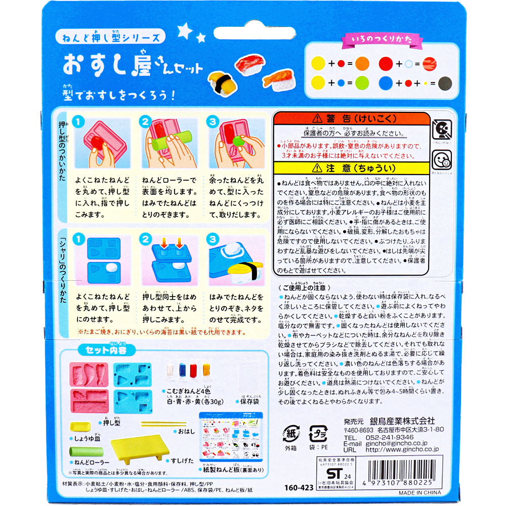 Four colors of wheat clay (white, blue, red, yellow) 30g each, storage bag, paper clay board (double-sided), four molds, clay roller, sushi mat, soy sauce dish, chopsticks