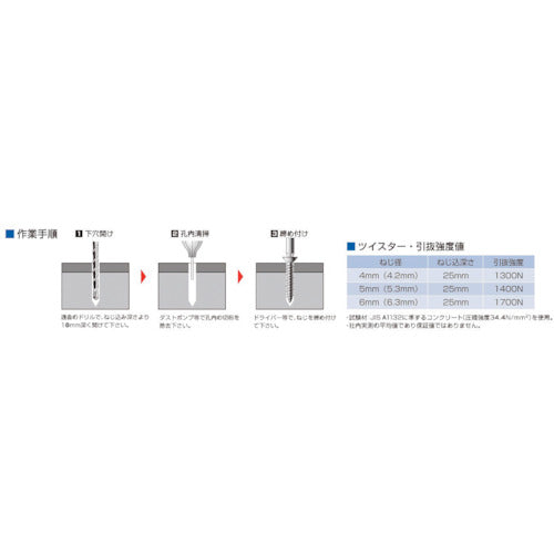 Catalog number: FC-6045P Features: ●Ideal for fastening various components to concrete substrates, and for attaching lightweight items such as pipe saddles. ●Uses Ruspart treatment for excellent retention and high corrosion resistance without the need for plugs. Applications: ●For attaching pipe saddles, guide plates, etc. to concrete substrates. Specifications: Nominal diameter d (mm): 6.3 Pilot hole diameter (mm): 5.3-5.5 Embedding depth (mm): 35 recommended Maximum tensile load (kN): 1.7 Drilling depth (mm): Embedding depth + 10 Length (mm): 45 Compatible driver: No. 3 TL (mm): 39 SL (mm): 6 Screw pitch (mm): 1.8 (14 threads) D (head diameter) (mm): 12 t (head height) (mm): 4 Concrete screw plugless anchor Flat head Sharp point High and low thread Material/Finish: Iron (equivalent to SWCH18A) Surface treatment: Ruspart Note: The embedding depth varies depending on the thickness and weight of the attachment, the strength of the concrete, etc., so please use according to the purpose. Pull-out strength test is performed by embedding the screw 25 mm into the test material: concrete compressive strength 34.4 N/mm (squared) conforming to JIS A1132. *The above pull-out strength values are average values of in-house measurements and are not guaranteed values. *Caution: Please note that larger pilot holes will reduce the pull-out strength. *Caution: Please wear safety goggles and a helmet as cutting chips will fly during work.