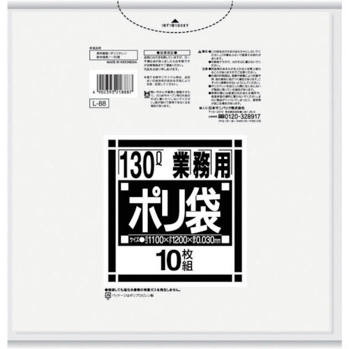 Catalog number: L-88 Features: ●Large type plastic bag. ●Made of polyethylene that does not generate harmful gases such as hydrogen chloride even when incinerated. Applications: ●Ideal for dust carts. Specifications: ●Length (mm): 1200 ●Width (mm): 1100 ●Thickness (mm): 0.03 ●Capacity (L): 130 ●Color: Transparent Material/Finish: ●Low density polyethylene (LLDPE)