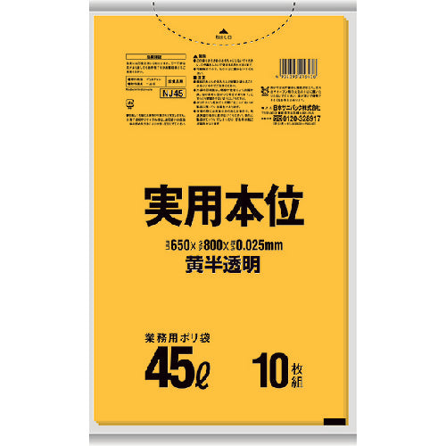 Catalog number: NJ45 Features: ●The perfect garbage bag for separating garbage. Uses: ●For separating garbage. Specifications: ●Height (mm): 800 ●Width (mm): 650 ●Thickness (mm): 0.025 ●Capacity (L): 45 ●Color: Yellow translucent Material/Finish: ●Low-density polyethylene (LLDPE)