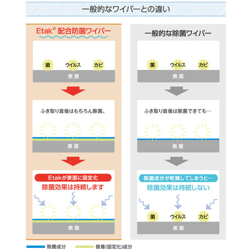 Catalog number: BW1531-WB Features: ● The patented ingredient Etak is used and fixed on the surface, providing sustained antibacterial and antiviral effects. Applications: ● For cleaning and antibacterial purposes on tables, handrails, doorknobs, around beds, toilet seats, toilets, etc. Specifications: ● Sheet size (mm): 150 x 300 ● Type: Main unit/alcohol ● Case quantity (sheets): 200 ● Alcohol type ● Main unit Material/Finish: ● Ingredients: Ethanol, ethoxysilane compound (sustained antibacterial and antiviral ingredient), etc.