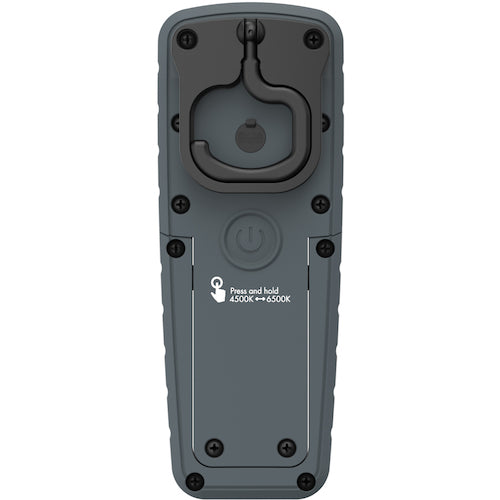 Catalog number: 03.5650 Features: ● A high color rendering light that can be used as a stand light or a hand light. ● Comes with a hook so it can be hung. ● The light source color (K) can be changed in two stages, making color matching and damage inspections more efficient. ● The unique average color rendering index (CRI+) is calculated from 15 colors and reproduces colors more accurately. ● Comes with a magnet function. ● Comes with a clip so it can be attached to a pocket, etc. ● It is suitable for color matching work because it can express colors naturally. ● Wide lens specification that can illuminate a wide area. ● Uses a high color rendering COB type LED light. Applications: ● For color matching, polishing, checking for scratches and finishes, etc. ● For night work. ● For working inside a warehouse or in a dark place. Specifications: ●Brightness (lm): 100/200 ●Width (mm): 60 ●Depth (mm): 38 ●Height (mm): 156 ●Charging time: 4 ●Power consumption (W): 3.5 ●Light source color: 4500K/6500K (2 levels) ●Color rendering index (CRI): Ra96 ●CIE (International Commission on Illumination): 013.3-1995 ●Power source: Rechargeable lithium-ion battery: 3.7V/1600mAh ●Maximum lighting time: 4 hours (when using 100lm)/2 hours (when using 200lm) ●Protection rating: IP65 ●Impact resistance: IK07 ●USB rechargeable ●Drop resistance (m): 1 ●Illumination range: 75° Set contents/accessories: ●USB charging cable: 1 Caution: ●Do not shine the light directly into the eyes.