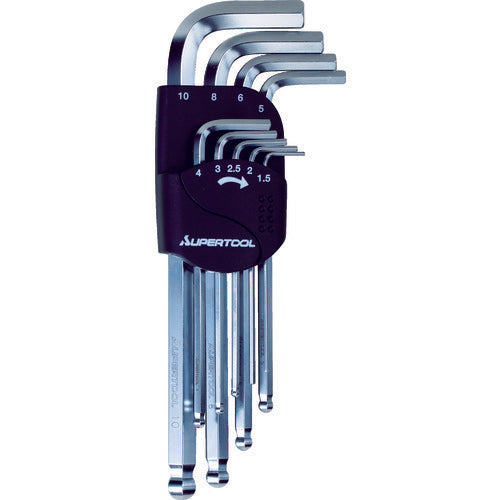 Catalog number: HKLB9S Features: ●High quality with high torque, high toughness, excellent durability, wear resistance, and corrosion resistance. ●The ball point allows tilting up to approximately 25 degrees. ●Long size. ●Hardness is 55 to 58HRC. ●Material is SNCM・V. ●Matte chrome plating. Uses: ●For tightening various hexagonal socket bolts. Specifications: ●Set contents (mm): 1.5, 2, 2.5, 3, 4, 5, 6, 8, 10 ●Set contents (pcs): 9 ●Set contents: HKL1.5, 2, HKLB2.5, 3, 4, 5, 6, 8, 10 Material/Finish: ●Special alloy steel (SNCM・V) ●Matte chrome plating Set contents/Accessories: ●Holder Note: ●1.5 and 2mm are normal hexagons.