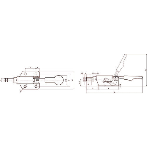 Catalog number: TP07F Features: ● Most models use stainless steel for the crimp (support) pins, making them suitable for long-term use. Applications: ● Ideal for inspection jigs, welding jigs, other assembly jigs, and processing jigs. Specifications: ● Total length (mm): 125 ● Pressing force (kN): 0.5 ● Attached bolt diameter: M5 x 15 ● Handle operation angle (°): 66 ● Stroke (mm): 10 ● Horizontal pressing type ● Flange base Material/Finish: ● General structural rolled steel Set contents/Accessories: ● Clamp bolt: TNN0515 Note: ● The listed support force is the maximum value. Please note that the value will decrease depending on the pressing position and bolt adjustment.