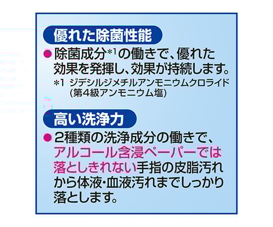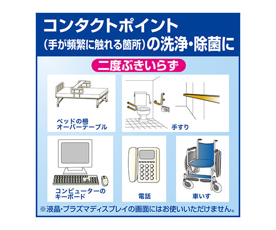 A disinfectant cleaning paper that can clean and disinfect environmental surfaces at the same time. For disinfecting and cleaning contact points. The antibacterial ingredients provide excellent and long-lasting effectiveness. The cleaning ingredients AG (*1) and AAO (*2) thoroughly remove sebum stains, body fluids, and blood stains from your hands that cannot be removed with alcohol-impregnated paper. *1 Alkyl glucoside *2 Alkyl amine oxide Contains cleaning ingredients that are gentle on materials and will not damage plastics (except polycarbonate). Non-chlorine, so it has no odor and will not damage metals (except some metals such as copper). Since it does not contain alcohol, it dries slowly and can be used to wipe a large area. You can wipe an area about 10 times the size of the sheet. Do not use on humans. *Refill packs "SafeKeep for Medical Facilities Refill Pack (80 sheets)" are also available. It has excellent disinfecting, cleaning and wiping properties. It is a non-chlorine type that is gentle on the surface to be wiped and does little damage to the substrate. Liquid components: Surfactant, disinfectant (dialkyne dimethyl ammonium salt) Paper material: Rayon, PET (polyethylene terephthalate), PE (polyethylene), PP (polypropylene) Liquidity: Weakly acidic Uses: Surfaces that come into contact with the hands of medical staff and patients (doorknobs, handrails, bed rails, equipment exteriors, etc.) Electrical switches on the floors of treatment rooms, ICUs (intensive care units), operating rooms, floors, toilets, etc. Infusion pump data panel, nurse call, computer keyboard, touch panel SafeKeep(R) Quantity: 1 box (80 sheets) Sheet size: 140 x 200 mm Non-alcoholic