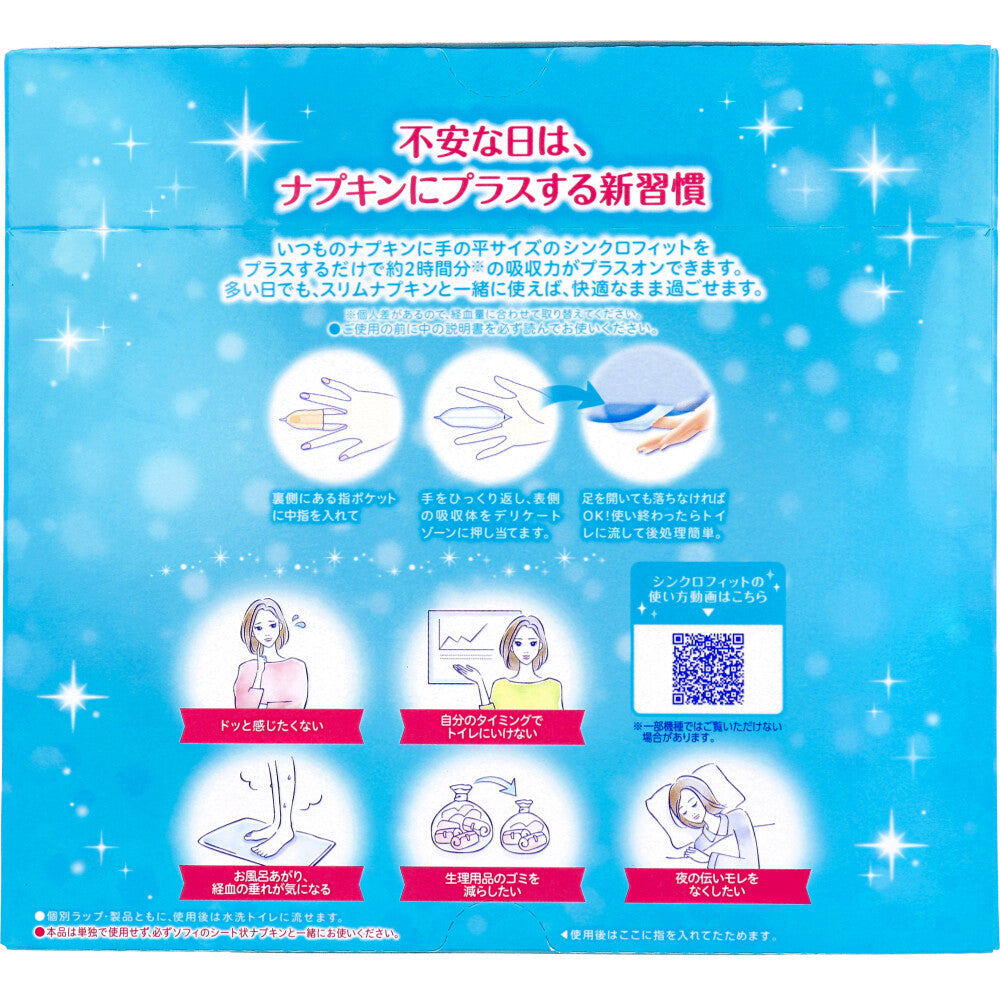 Add extra absorbency. Try adding this to your napkins on those worrying days. ●Just by adding a palm-sized Synchro Fit to your regular napkin, you can add approximately 2 hours of absorbency. *Since this varies from person to person, please replace the diaper according to your menstrual flow. ●Even on heavy days, you can stay comfortable by using it together with slim napkins. ●It absorbs directly so it doesn't spread out! It is absorbed directly by sandwiching it between your body, so even if it comes out in a big gush, it won't spread onto the napkin! ●Thick type with greater absorbency than the regular type. It's a thicker type with higher absorbency than the regular type, which adds an extra 2 hours of absorbency, so you can rest assured! ●Both the individual wraps and the product can be flushed down the toilet, making replacement easy! *Do not use this product alone. Always use it together with Sofy sheet napkins. *Please be sure to read the instructions included before use. ●Recommended for these situations! ・I don't want to feel that thud. I can't go to the bathroom at my own pace. ・I want to stop leaking at night. - I'm worried about menstrual blood dripping after taking a bath. ・I want to reduce waste from sanitary products. [Quasi-drugs] Sanitary napkins Sales name: Sophie wpn [Materials] Surface material: polyester, rayon Color tone: Orange (including Direct Yellow 12/Direct Red 81), white 【specification】 Use: For heavy flow during the day Type: Thick type [How to use] (1) Place your middle finger in the finger pocket on the back (2) Turn your hand over and press the absorbent surface against your sensitive areas. (3) If it doesn't fall off even when you spread your legs, it's OK! After use, just flush it down the toilet for easy cleanup. ・Replace as needed during menstruation. ★Disposal after use - Sit down, spread your legs wide and tilt your body slightly to the side and the Synchro Fit will come off your body without touching it. ・If it does not work, pinch the removal knob and remove it from your body. [Precautions for use] - To prevent the toilet from clogging, flush each Synchro Fit sheet with a large amount of water. - If the product does not suit your skin, consult a doctor. - If you continue to experience discomfort when wearing the product, discontinue use. ・Do not use this product alone; always use it together with Sofy sheet napkins. - Do not flush the napkins used together down the toilet. ・Do not insert SynchroFit into the vagina. - Once removed, do not reuse the SynchroFit; replace it after each use of the toilet. -For hygiene reasons, please change your sanitary napkins at least once a day. ★Storage precautions ・After opening, store hygienically to prevent foreign objects such as dust and insects from entering.
