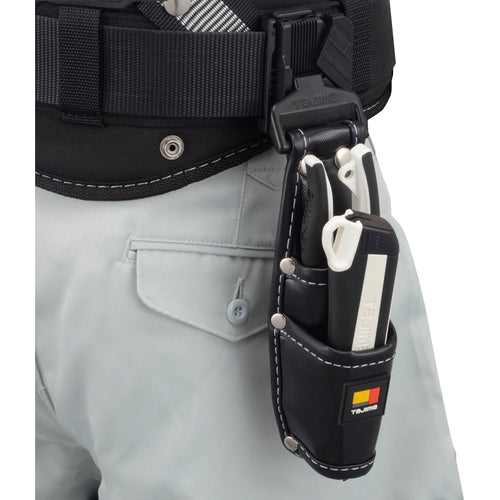 Catalog number: SFKSN-P2 Features: ●Detachable type that can be easily rearranged around the waist. ●Comes with a slide stopper for the safe holder that can be attached and detached without removing the belt. ●Space-saving design with minimal width. ●Uses a retrofit holder that can be inserted from the middle without removing the belt. ●Uses Tajima's original fabric with a 5-layer structure that sandwiches EVA foam material between high-density nylon fabric coated with PVC film. Uses: ●Detachable tool holder for construction work sites Specifications: ●Color: Black ●Shape: Tool holder for 2 tools ●Width (mm): 65 ●Depth (mm): 100 ●Height (mm): 255 ●Type: Tool holder ●Belt loop width: 50mm ●Total weight of items stored when safe is installed: 3kg ●Waterproof ●Replacement: Slide stopper for safe holder SF-CHLDST Material/Finish: ●PVC film ●High-density nylon ●EVA foam material