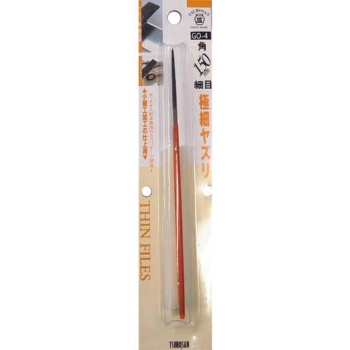 Catalogue number: GO-4 Features: ● Suitable for grinding narrow areas. Applications: ● For finishing small work. ● For processing all kinds of metals, including iron. Specifications: ● Type: Fine ● Shape: Square ● Total length (mm): 150 ● Blade length (mm): 40 ● Blade width (mm): 2 ● Blade thickness (mm): 2 Material/Finish: ● Carbon tool steel (SK-2) Caution: ● If the teeth become clogged, remove them with a brush or similar before using.