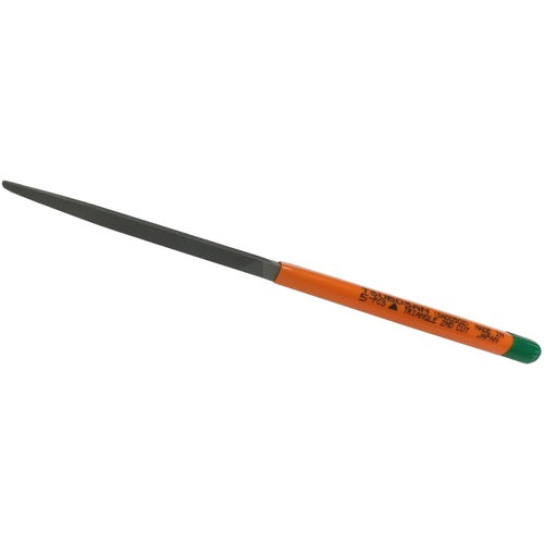 Catalog number: SA010-04 Features: ● Sharply sharpened and highly durable. The blade is engraved on the entire surface. ● 44 cuts per cm. Uses: ● For processing all metals, including iron. Specifications: ● Type: 10-piece set, oil-grained ● Total length (mm): 185 ● Blade length (mm): 85 ● Blade width (mm): 6 ● Blade thickness (mm): 6 ● Shape: Triangular ● Grit: 04 (oil-grained) Material/Finish: ● Carbon tool steel (SK-2) Caution: ● If the teeth become clogged, remove them with a brush or similar before use.