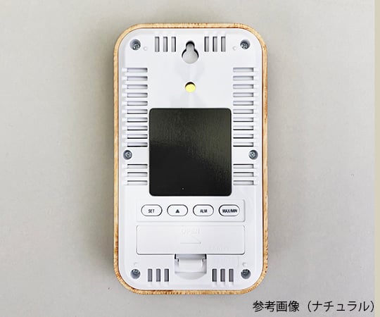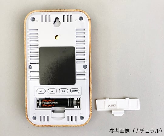 "A vertically long thermo-hygrometer with a wood grain pattern"