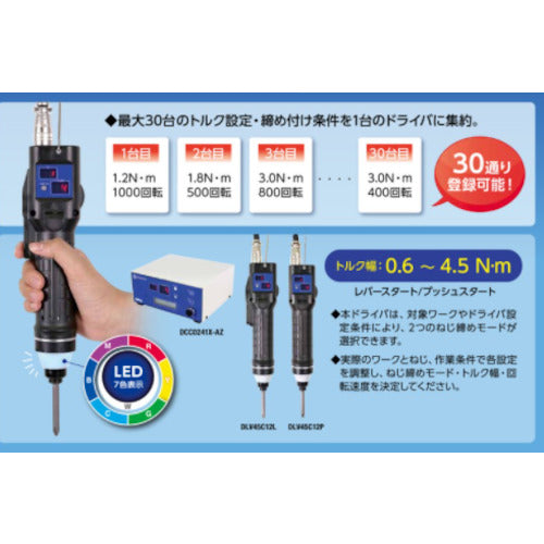 Catalog number: DLV45C12P-AZ K Features: ●30 torque settings possible with one driver. ●Torque current control type ideal for screw tightening. ●Equipped with a low-voltage brushless motor. ●Equipped with ESD protection (antistatic performance). ●Software can be downloaded from the Nitto Kohki website. Applications: ●For ordinary small screws. Specifications: Output torque (N・m): 0.6-4.5 Suitable screws (mm) Small screws: 3.0-6.0 Power cord length (m): 2 No-load rotation speed (min-1): SOFT: 400-1200 HARD: 100-700 Suitable screws (mm) Tapping screws: 2.5-5.0 Power consumption (W): 44 Overall length (mm): 248 Bit face size (mm): 6.35 Torque adjustment: 1-100% Adjusted in 1% increments Width (mm): 56 Height (mm): 248 Start method: Push start Input power: Supplied from dedicated controller Bit face size: 6.35mm Suitable controller (sold separately): DCC0241X-AZ Power cord for suitable controller (sold separately): DLW9210 Set contents/accessories: Connection cord 2m DLW9078: 1 pc. NK Bit 35 (NO.2×7×75): 1 pc. Hanging bracket: 1 pc.