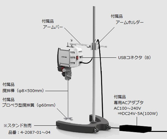 Accessories: Propeller-type stirring blade (60 mm), stirring blade fixing nut, stirring rod (φ8 x 500 mm), arm holder, arm bar