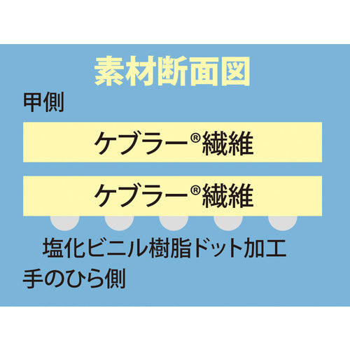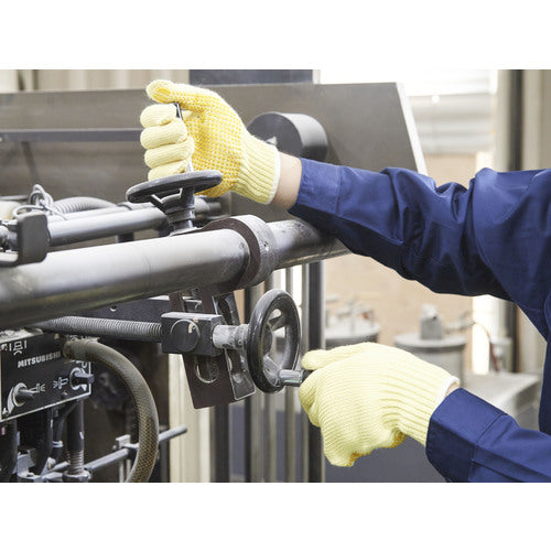 Catalogue number: K-300-M Features: ●Excellent cut resistance and abrasion resistance. ●Vinyl dot processing on the palm provides excellent grip. Applications: ●Iron and steel, automotive-related, metal processing. Specifications: ●Color: Yellow ●Size: M ●Total length (cm): 22.8 ●Palm circumference (cm): 21.0 ●Middle finger length (cm): 7.8 ●Thickness (mm): Approximately 4.0 ●Gauge number: 7 ●Wrist color: Navy ●Anti-slip: Yes ●7-gauge knit ●Cut resistance level: 3/C (EN388: 2016) Material/Finish: ●Fiber part: Kevlar [R] fiber ●Anti-slip part: PVC resin
