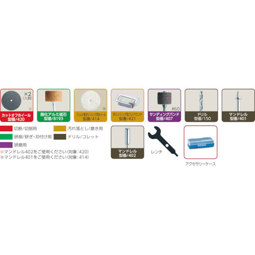 Catalog number: 3000-N/10-60 Features: ●Easy twist system, quick and easy replacement of accessories without a wrench. ●Improved cooling system improves cooling efficiency by 20% compared to previous models, and durability has been improved. ●Soft rubber grip fits perfectly in your hand even when holding it like a pen. ●Maximum 32,000 rpm stepless speed change allows for a variety of materials and applications, and the high rotation speed makes work quick and smooth. Applications: ●Engraving/machining. ●Beveling. ●Grinding/sharpening. ●Cutting. ●Cutting. ●Removing dirt/polishing. ●Polishing. ●Drilling. Specifications: ●No-load rotation speed (min-1): 10,000-32,000 ●Outer diameter (mm): 56 ●Total length (mm): 188 ●Power supply (V): 100 (60Hz) ●Power cord length (m): 2 ●Power consumption (W): 90 ●Frequency (Hz): 60 ●Compatible collets (mm): 0.8/1.6/2.4/3.0/3.2 ●Standard collet: 3.2mm ●10 types of accessories come standard ●Usable collet diameter: 0.8/1.6/2.4/3.0/3.2mm ●10 accessories come standard. Material/Finish: ●Polyamide resin Set contents/Accessories: ●Cut-off wheel part number 420, Grindstone: part number: 8193, Sanding band: part number 407, Polishing wheel: part number 414, Polishing compound: part number 421, Sanding band: part number 407, Drill: part number 150, Mandrel: part number 401, Mandrel: part number 402 ●Wrench ●Easy twist system ●Accessory case
