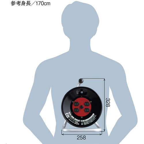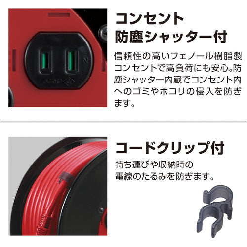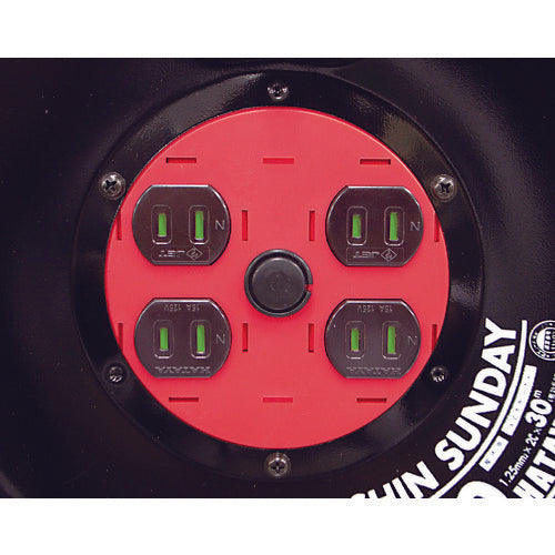 Catalogue number: C-30SIN Features: ● A simple and easy-to-use cord reel. ● Outlet with dustproof shutter: Prevents dust from entering the inside of the outlet. Applications: ● Construction and building sites. ● Painting industry. ● Maintenance. ● Civil engineering work. ● DIY. Specifications: ● Wire type: VCT ● Wire specification length (m): 30 ● Wire specification thickness ([[MM2]]): 1.25 ● Wire specification number of cores (C): 2 ● Rated current (A): 4 ● Limit current (A): 15 ● Outlet specification rating: 2P, 15A, 125V ● Outlet specification shape: [[Two-phase 2]] ● Number of outlets: 4 ● Rated voltage (V): 125 ● Body color: Black ● AC100V ● Outlet with dustproof shutter Materials/Finish: ● Disk: Steel plate ● Wire: Vinyl capacitor Caution: ● For indoor use