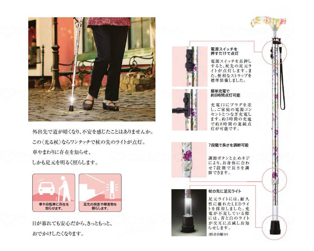 An LED light is built into the tip of the cane, and by simply pressing the switch on the top of the cane, it gently illuminates the area around your feet.