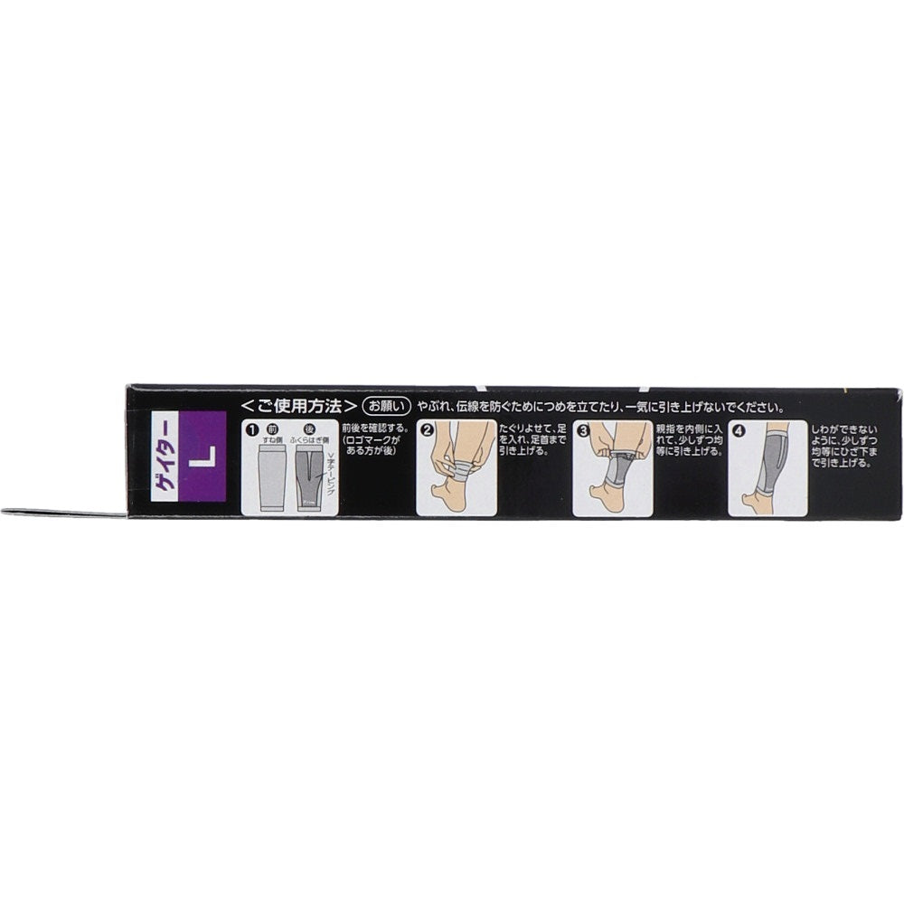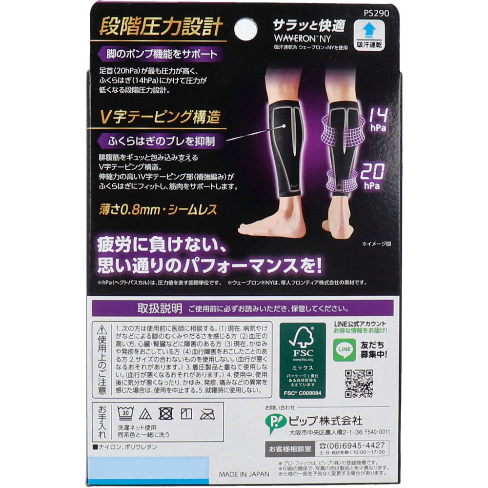 Don't give in to fatigue, and perform as you expect! Graduated compression design and V-shaped taping structure provide firm support for your calves. Helps reduce muscle strain! ● Graduated pressure design with the highest pressure at the ankle (20hPa) and decreasing pressure towards the calf (14hPa). ●V-shaped taping design that tightly wraps around and supports the calf muscles. ●The highly elastic V-shaped taping section (reinforced knit) fits the calf and supports the muscles. ●Made with sweat-absorbing, quick-drying Wavelon NY* yarn, it is smooth and comfortable. *Wavelon NY is a material from Teijin Frontier Co., Ltd. ●A seamless material with good breathability and a thickness of about 0.8 mm. [Material] Nylon, polyurethane 【size】 M: Calf circumference: 30-40cm / Ankle circumference: 20-24cm L: Calf circumference: 35-45cm / Ankle circumference: 22-26cm [How to choose the size] Measure your calf and ankle circumference. *If you fall between two sizes, choose the size that is closer to the median measurement. [How to use] *To prevent tearing, do not use your fingernails or pull it up all at once. 1. Check the front and back. 2. Pull it in, put your foot in, and pull it up to your ankles. 3. Place your thumbs inside and pull up evenly, little by little. 4. Pull the garment up evenly little by little to below the knee to avoid wrinkles. [Caution] 1. The following people should consult a doctor before use. (1) Those who currently experience leg swelling or fatigue due to illness or injury (2) People with high blood pressure or heart, kidney, or other disorders (3) Those currently experiencing itching or rashes (4) People who have experienced circulatory disorders 2. Do not use items that are the wrong size. (This may cause poor blood circulation.) 3. Do not use with other compression products (this may cause poor blood circulation). 4. If you experience any abnormalities such as unhappiness, itching, rash or pain during or after use, discontinue use. 5. Do not use while sleeping.