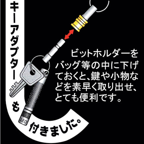 Catalog number: BTH-22RW Features: ● Colorful and compact, 2-piece bit holder with carabiner that can be attached and detached with one-touch slide. ● Available in a wide variety of colors. ● Convenient for carrying driver bits and socket bits. ● Set with carabiner, so you can easily add holders. ● Comes with a key adapter that is convenient for attaching small items and keys. Uses: ● For carrying tool tips such as driver bits and socket bits. Specifications: ● Color: Red & White ● 6.35mm drive shaft ● Round shaft compatible ● Comes with key adapter Material/Finish: ● Bit holder: Steel, aluminum ● Carabiner: Aluminum Caution: ● Be sure to attach bits etc. securely to the holder and make sure they do not fall out before using. ● Do not use drill bits, pilot hole bits, or other sharp objects as they are dangerous. ● Do not attach items weighing more than 500g per holder. ● Make sure there are no cracks or other symptoms on each part before using.