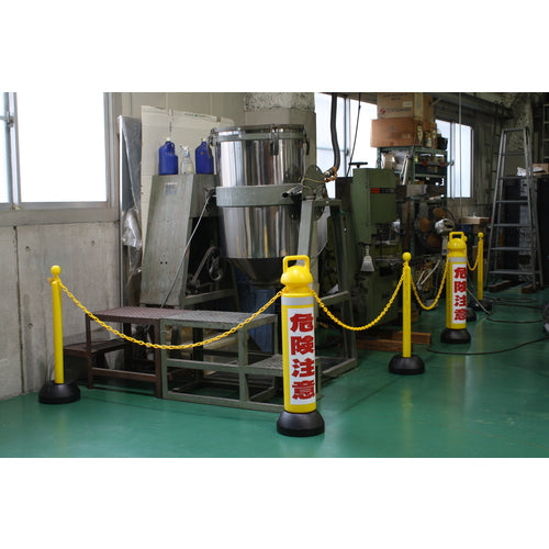Catalogue number: SF-73-C Features: ● A convenient stand that can be simply placed to guide people or to designate areas where entry or parking is prohibited. ● The base can be filled with water or sand and used as a weight. (When full of water: approx. 4 kg, when full of sand: approx. 5 kg) ● Made of resin, it is light and will not rust even if it gets wet in the rain. ● Comes with a handle for easy carrying. Specifications: ● Pole color: Yellow ● Width (mm): 255 ● Height (mm): 930 ● Pole diameter (mm): 167 ● Display content: Danger caution ● Comes with hooks on both sides for attaching chains (suitable chain diameter: 6 mm, 8 mm) ● Comes with a display sticker on one side Material/Finish: ● Polyethylene (PE)
