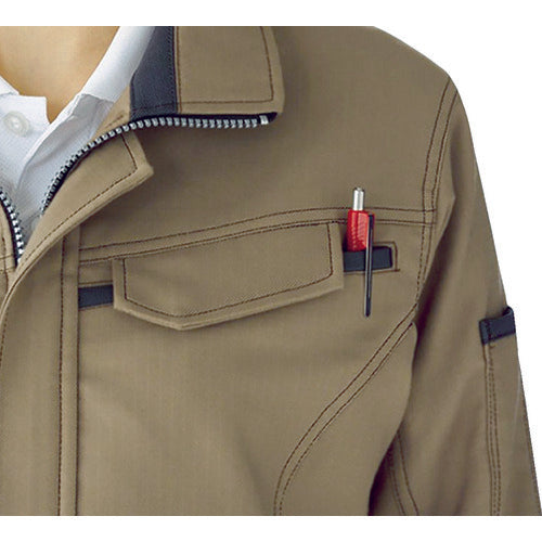 Catalog number: VEL520UE-13 Features: ● Achieves both functionality and a beautiful silhouette for women. ● The new three-dimensional cut structure of the sleeves allows for comfortable arm movement without stress in 360 degrees. The hem does not lift up even when the arms are raised, preventing the inner layer from coming out. ● Stretchy fabric is used. ● Comes with an internal storage pocket. ● This product is eligible for the Japan Breast Cancer Pink Ribbon Campaign. Uses: ● For use at work sites. ● Construction industry. ● Manufacturing industry. ● Transportation industry. ● Inspection and maintenance. ● Logistics. ● Moving. ● Building maintenance. ● Cleaning. Specifications: ● Color: Ivory ● Size: 13 ● Length (cm): 64 ● Chest circumference (cm): 114 ● Sleeve length (cm): 58 ● Shoulder width (cm): 42 ● Antistatic workwear JIS compliant Material/Finish: ● 80% polyester, 20% cotton ● Ripstop twill ● Zipper, dot button: Resin Note: ● Due to overseas fabric and dyeing, slight color variations may occur.