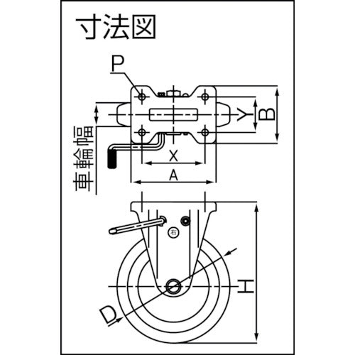 Catalog number: RWKB200 Features: ●Standard pressed caster. ●Red rubber wheels are used, so wheel marks are not left on the floor. ●Polybutadiene rubber wheels are used, so they are highly elastic and can be transported lightly. Applications: ●General-purpose transport carts ●Transport carts for places where the floor surface does not get dirty Specifications: ●Wheel diameter D (mm): 200 ●Type: Fixed type (with stopper) ●Allowable load (daN): 245 ●Allowable load (kgf): 250 ●Wheel width (mm): 45 ●Mounting height H (mm): 250 ●Mounting seat A (mm): 151 ●Mounting seat B (mm): 102 ●Mounting pitch X (mm): 112 ●Mounting pitch Y (mm): 63 ●Mounting hole diameter P (mm): 11.5 ●Plate type ●Fixed type (with stopper) Materials/Finish: ●Metal fittings: Steel ●Metal fittings surface treatment: Trivalent unichrome plating finish ●Wheels: Steel wheels, rubber Notes: ●Left-side levers are also available. (RWKBL)