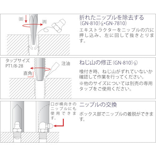 Catalog number: GN-810-1/8 Features: ●Removing broken nipples, repairing threads, and replacing nipples can all be done with this one tool. Uses: ●For attaching and removing nipples. Specifications: ●D(mm): 15 ●L(mm): 125 ●Box size: 8mm, 10mm Tap size: 1/8PT-28 Material/Finish: ●Carbon steel