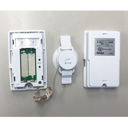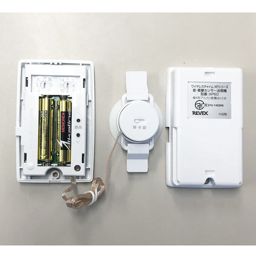 Catalog number: XP60 Features: ●You can receive notifications of incoming calls and doorbells from a distance. ●You can detect window impacts and receive notifications from a distance. ●You can easily attach it to a telephone or doorbell. ●You can select a song for each transmitter, so you can tell which one is responding even when using multiple units. Specifications: ● Chime type: Sound/shock sensor ● Product name: Sound/shock sensor transmitter ● Transmitter width x depth x height (mm): 56 x 28 x 87 ● Power supply (V): 2 x AAA alkaline batteries (sold separately) ● Battery life: Approximately 2 months (10 times/day operation: 20°C) ● Sensitivity switching: Weak/medium/strong switch to switch sensor sensitivity ● Low battery indication: LED flashes when the sensor detects sound ● Transmission indication LED: Red LED lights up (for approximately 4 seconds) ● Transmission radio band: Specific low power (315MHz band) ● Operating temperature range: -10°C to +45°C ● Main unit external dimensions: Main unit = W55 x H87 x D28 / Sensor part = Φ38 x D21 ● Weight: Approximately 85g (excluding batteries) Material/Finish: ● ABS resin Set contents/Accessories: ● 1 transmitter ● Double-sided tape ● Screws ● Ribs ● Mini driver for switching ID code