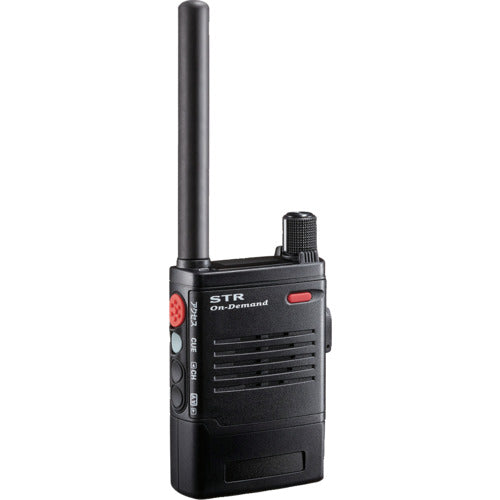 Catalog number: SRFD55-B Features: ●Even if there is interference, the teleport function allows you to easily move channels and shut out interference. ●Dual channel reception allows you to monitor two operations at the same time. ●24mm slim body, robust, dustproof and waterproof (IP68) structure. ●Built-in high-quality, loud speaker with class-leading 700mW. ●Two PTT operations can be used together: one-click hands-free, which starts transmission with one click and automatically returns to reception when the conversation is finished, and conventional PTT operation with a long press. Applications: ●For communication within factories and construction sites. Specifications: ●Color: Black ●Width (mm): 58 ●Depth (mm): 23.5 ●Height (mm): 83 ●Antenna length (mm): 99 ●Compatible repeater: EXR100A ●Urban call distance (km): 0.1-0.2 ●Suburban call distance (km): 1 ●Audio output (mw): 700 ●Power source: Rechargeable, dry battery ●Protection rating: IP68 ●License/qualification required: Not required ●Transmitting/receiving frequency (MHz): Alternate call (simplex) 422MHz band, relay call (semi-duplex) 421MHz band/440MHz band ●Number of channels: 20ch for alternate calls, 27ch for relay calls Set contents/accessories: ●Belt clip Note: ●A lithium-ion battery and charger, or a dry battery case (sold separately), are required to use this product.