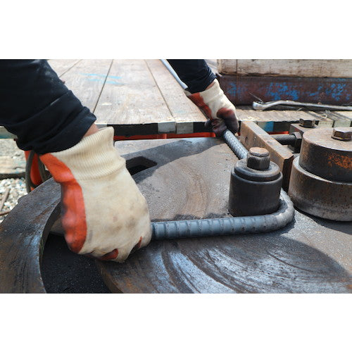 Catalog number: 1801-M Features: ●The shape of the gloves is finished in a shape that is relaxed (curved), so they fit the hand, making it easy to work and preventing hand fatigue. ●Antibacterial and deodorizing treatment has been applied. ●Made of breathable knitted fabric (back of hand). Applications: ●Reinforcing bar, steel frame work, civil engineering, and construction industry Specifications: ●Color: Orange ●Size: M ●Total length (cm): 24 ●Palm circumference (cm): 21 ●Middle finger length (cm): 7.7 ●Thickness (mm): 1.3 ●Palm: 24 gauge knit, back of hand: 21 gauge knit ●Antibacterial and deodorizing treatment Materials/Finish: ●Glove part: 100% cotton ●Anti-slip part: Polyvinyl chloride (PVC)