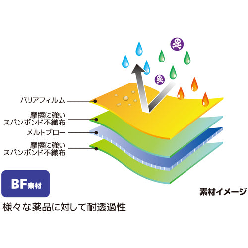 Catalog number: C8000 Features: ●Excellent permeation resistance to inorganic chemicals. ●High barrier properties against infectious disease and other hazardous liquids. Applications: ●Work involving handling inorganic chemicals ●Infectious disease prevention ●Prevents stains Specifications: ●Color: Yellow ●Size: Free size ●Complies with JIS T 8115 standards Type 3/4/6 ●Disposable type ●Anti-static processing ●With anti-slip properties Material/Finish: ●Polyethylene ●Polypropylene Caution: ●Dispose of in accordance with local government regulations after use.