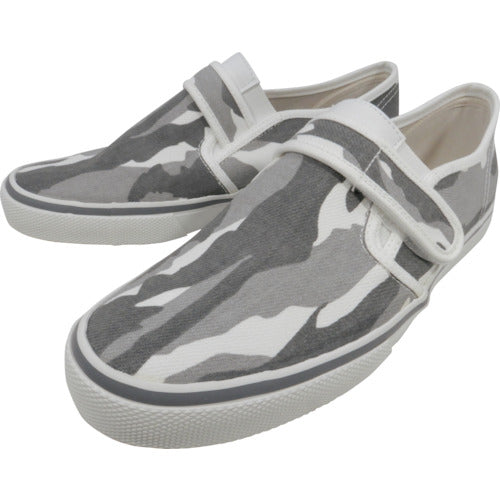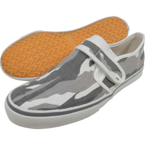 Catalog number: V1100CF-27.0 Features: ● Equipped with a non-slip Hyper V sole, it is safe and non-slip even on roofs. ● There is a Velcro strap on the instep, making it difficult to slip off. ● There is a non-slip (toe stopper) on the toe part inside the shoe, which helps you to stand on slopes. Uses: ● Roof work and other general work. Specifications: ● Dimensions (cm): 27.0 ● Color: Camouflage ● Foot width size: EE ● Size: 27.0 ● Dynamic friction coefficient of sole: 0.30 or more Material/Finish: ● Body: Cotton ● Sole: Rubber Caution: ● The rubber on the sole is not oil-resistant, so it may absorb oil and swell.