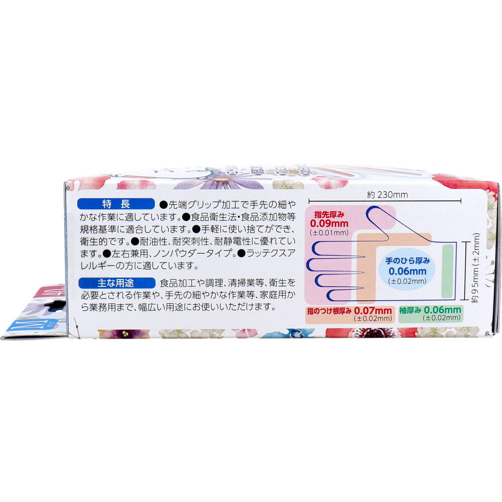 Thickness (all three sizes): Fingertip thickness 0.09mm (±0.01mm), finger base thickness 0.07mm (±0.02mm), palm thickness 0.06mm (±0.02mm), sleeve thickness 0.06mm (±0.02mm) [Note]