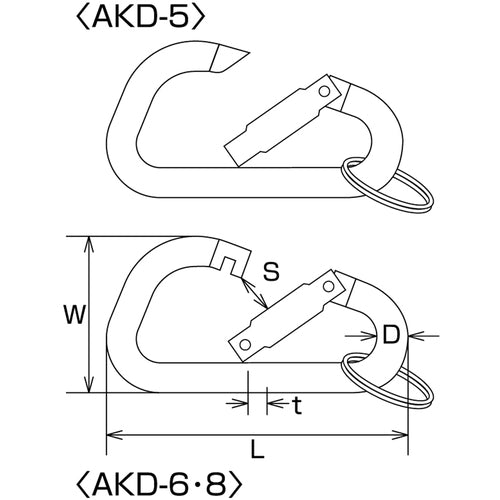 Catalogue number: B-1401 Features: ●Spring hook. ●The opening part returns to its original position due to the force of the spring. Applications: ●For accessories, etc. Specifications: ●Color: Silver ●Working load (kN): 0.20 ●D (mm): 6 ●L (mm): 60 ●S (mm): 9 ●W (mm): 32.5 ●t (mm): 5 Materials/Finish: ●Body: Aluminum alloy ●Double link: Iron (nickel plated) Caution: ●Not for mountain climbing.